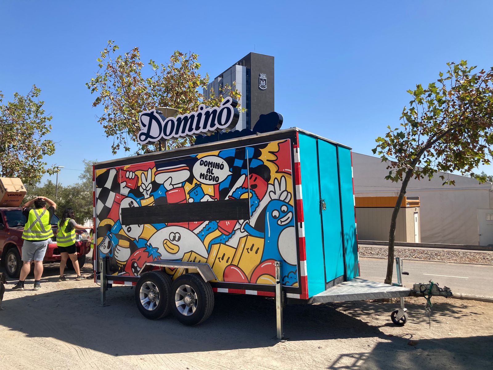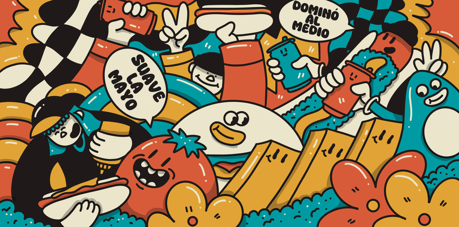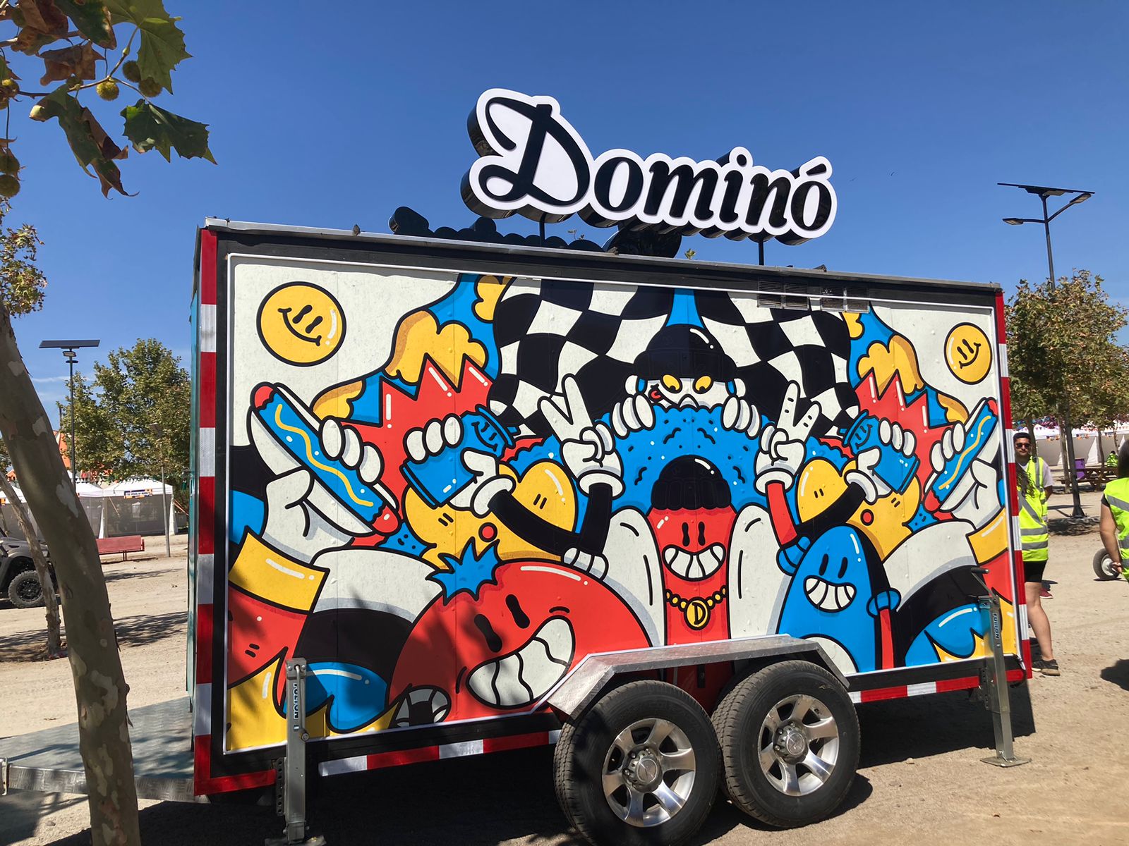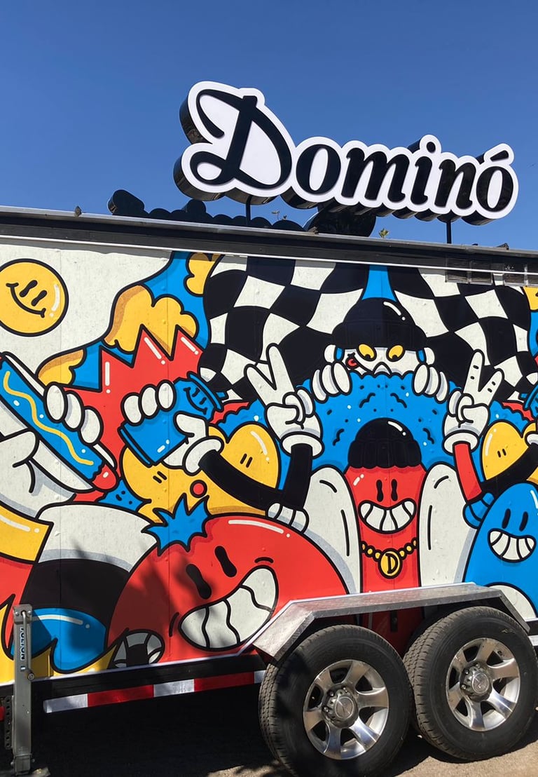 An illustration created to wrap the Dominó foodtruck at Lollapalooza Chile 2024, transforming it into a visually striking landmark within the festival.