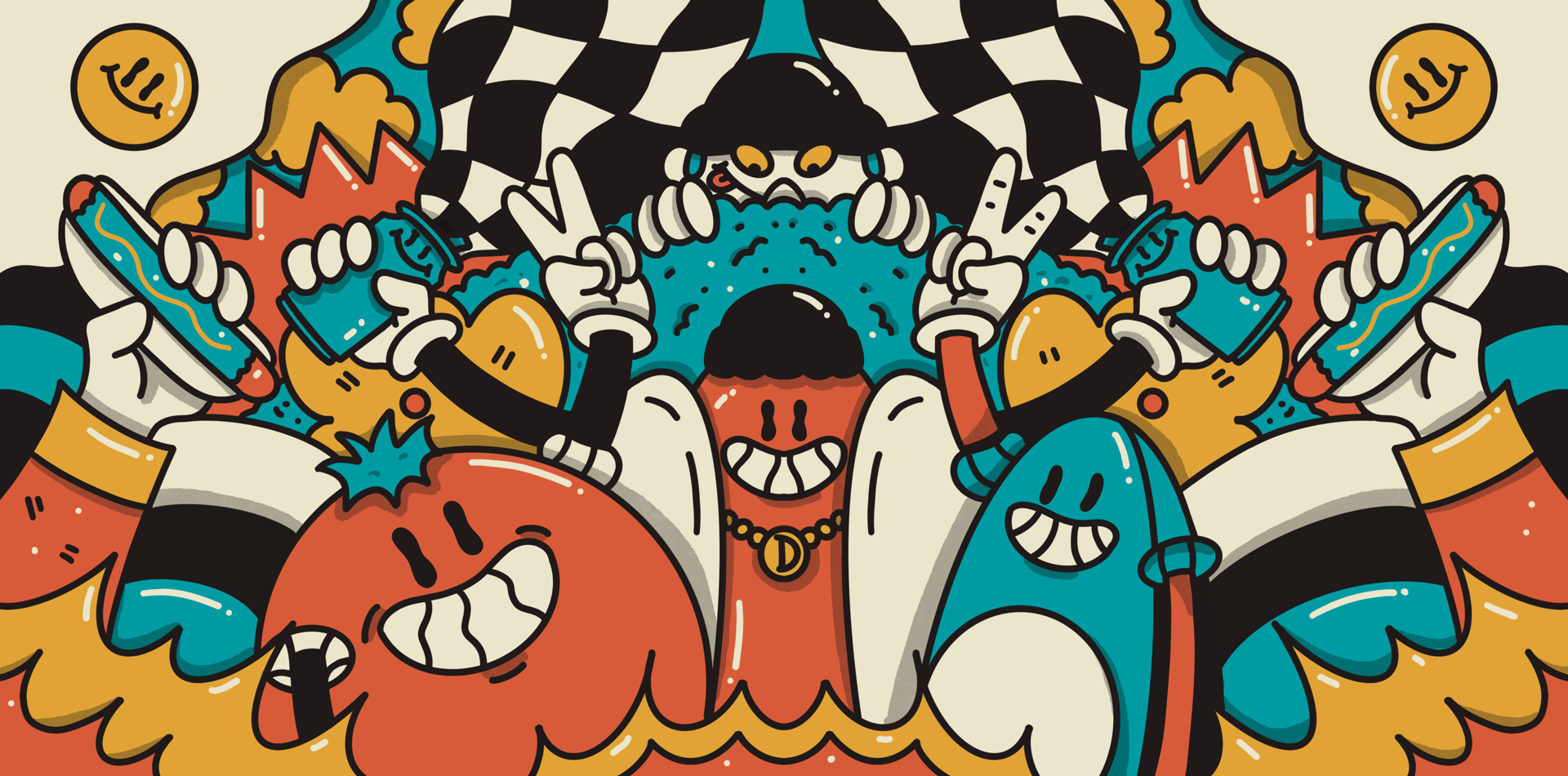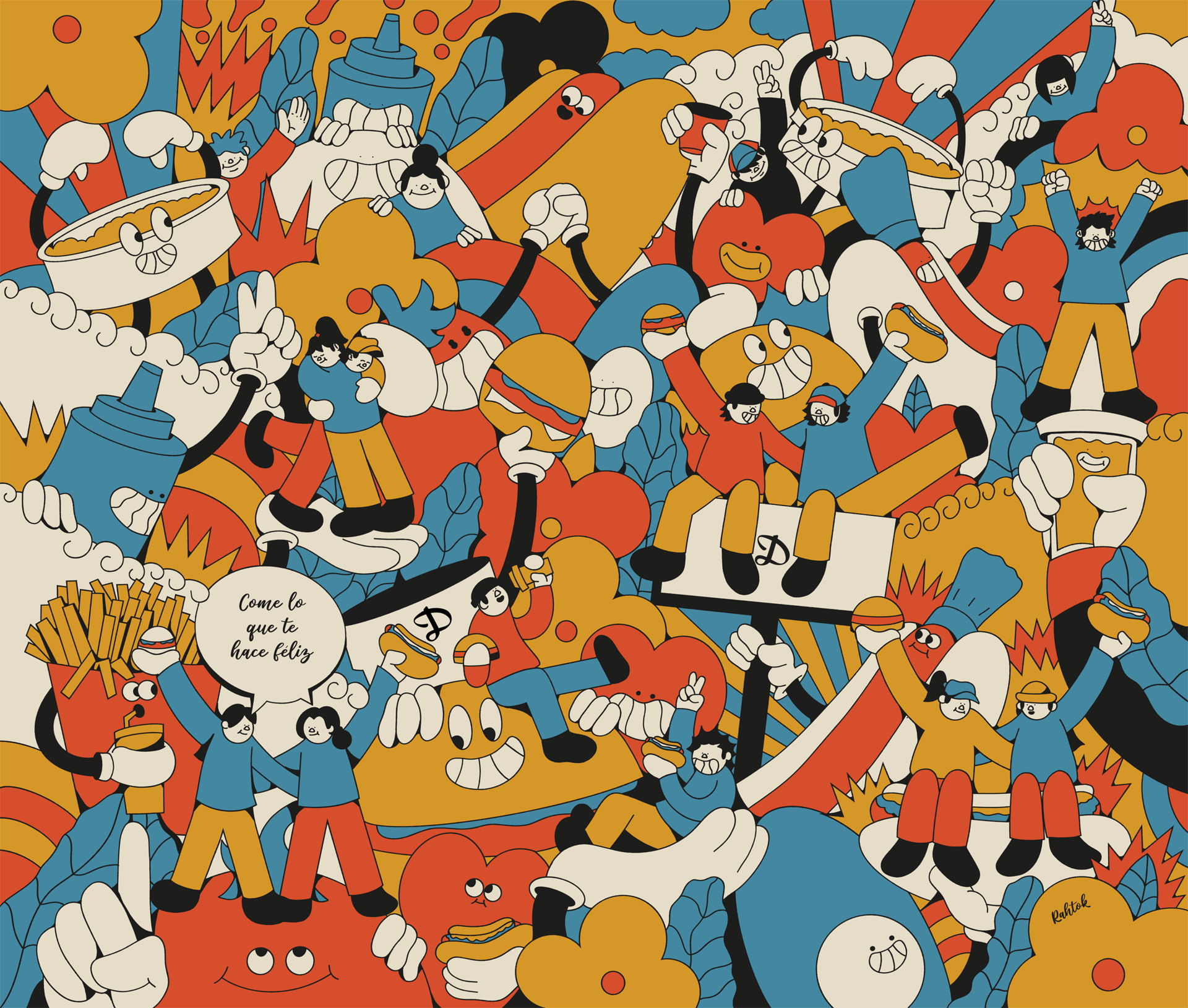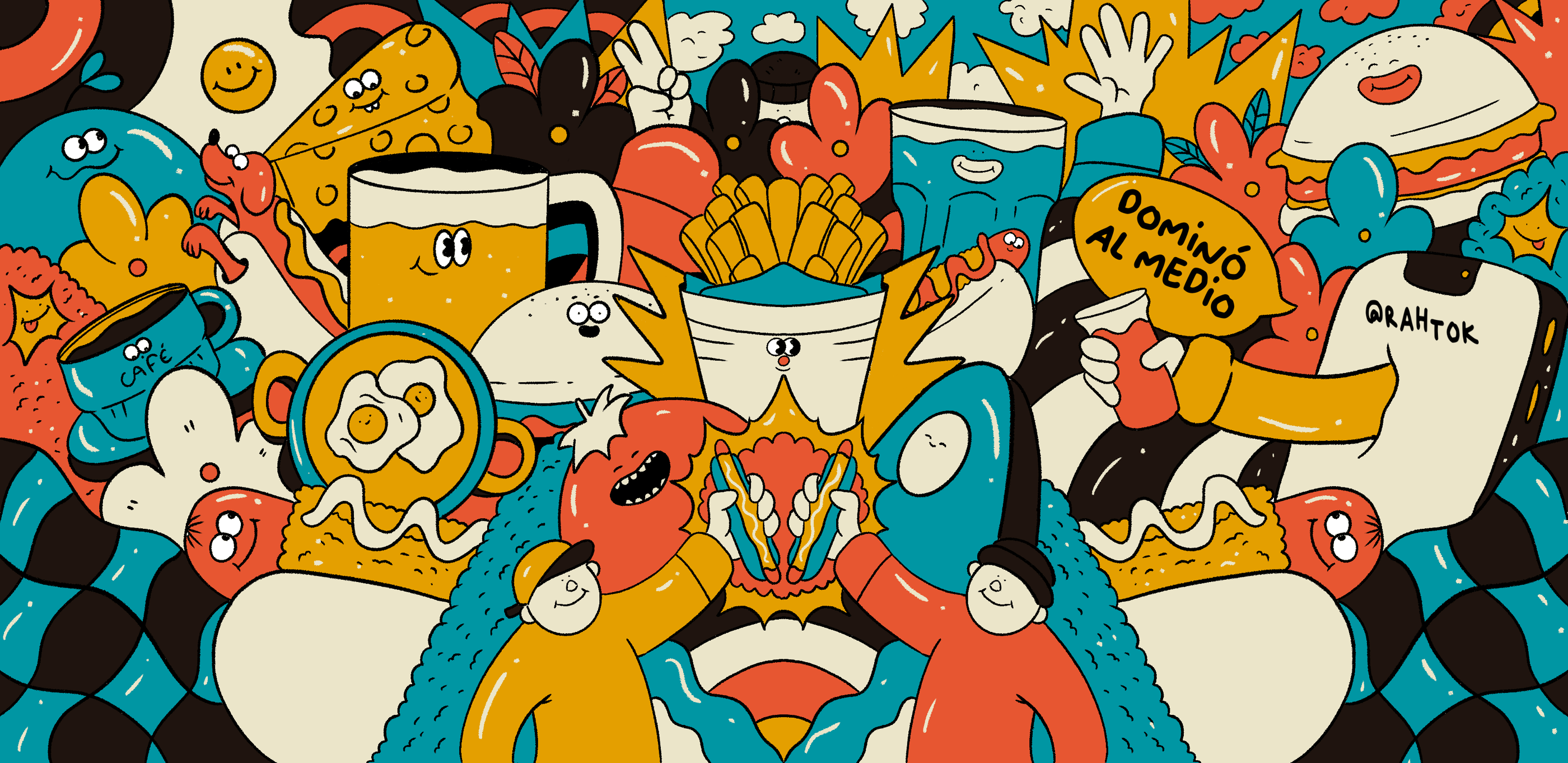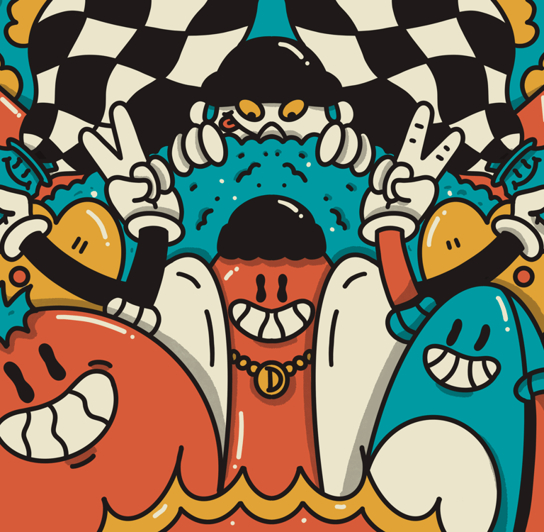 An illustration created to wrap the Dominó foodtruck at Lollapalooza Chile 2024, transforming it into a visually striking landmark within the festival.